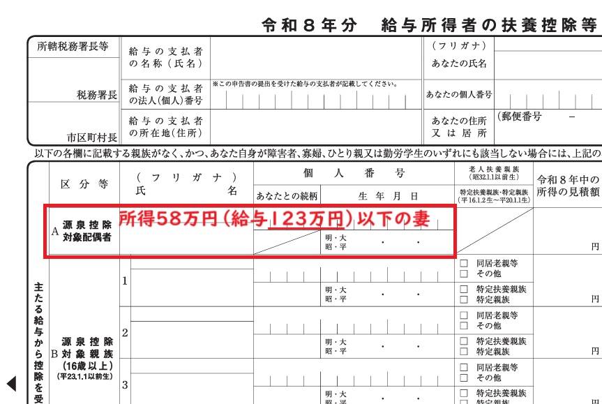 ここに書けるのは(給与収入が)123万円に収まっている配偶者だけです。