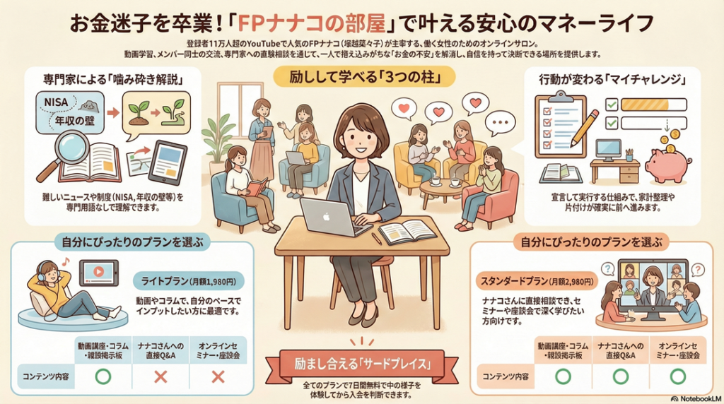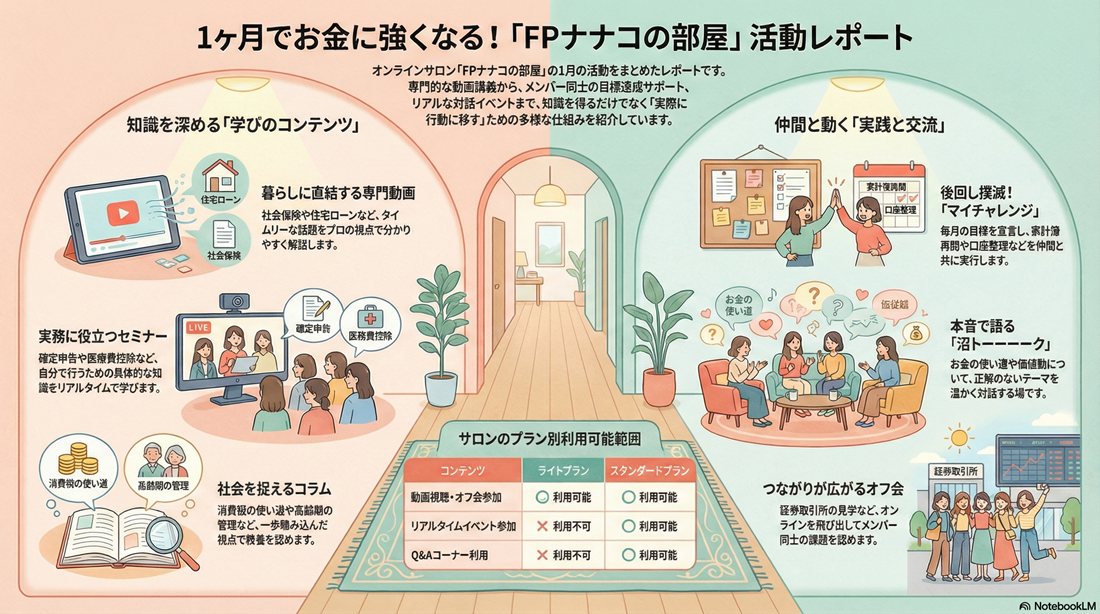 運営しているオンラインサロン「FPナナコの部屋」では、「暮らしに役立つお金の知識」をテーマに、毎月さまざまなセミナーや動画、Q&Aを通じて学び合っています。