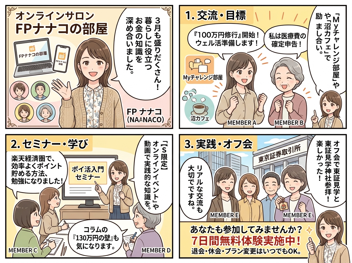 オンラインサロン「ナナコの部屋」では、このように オンラインイベント・動画・Q&A・交流 を通じて、暮らしに役立つお金の知識を楽しく身につけられます。